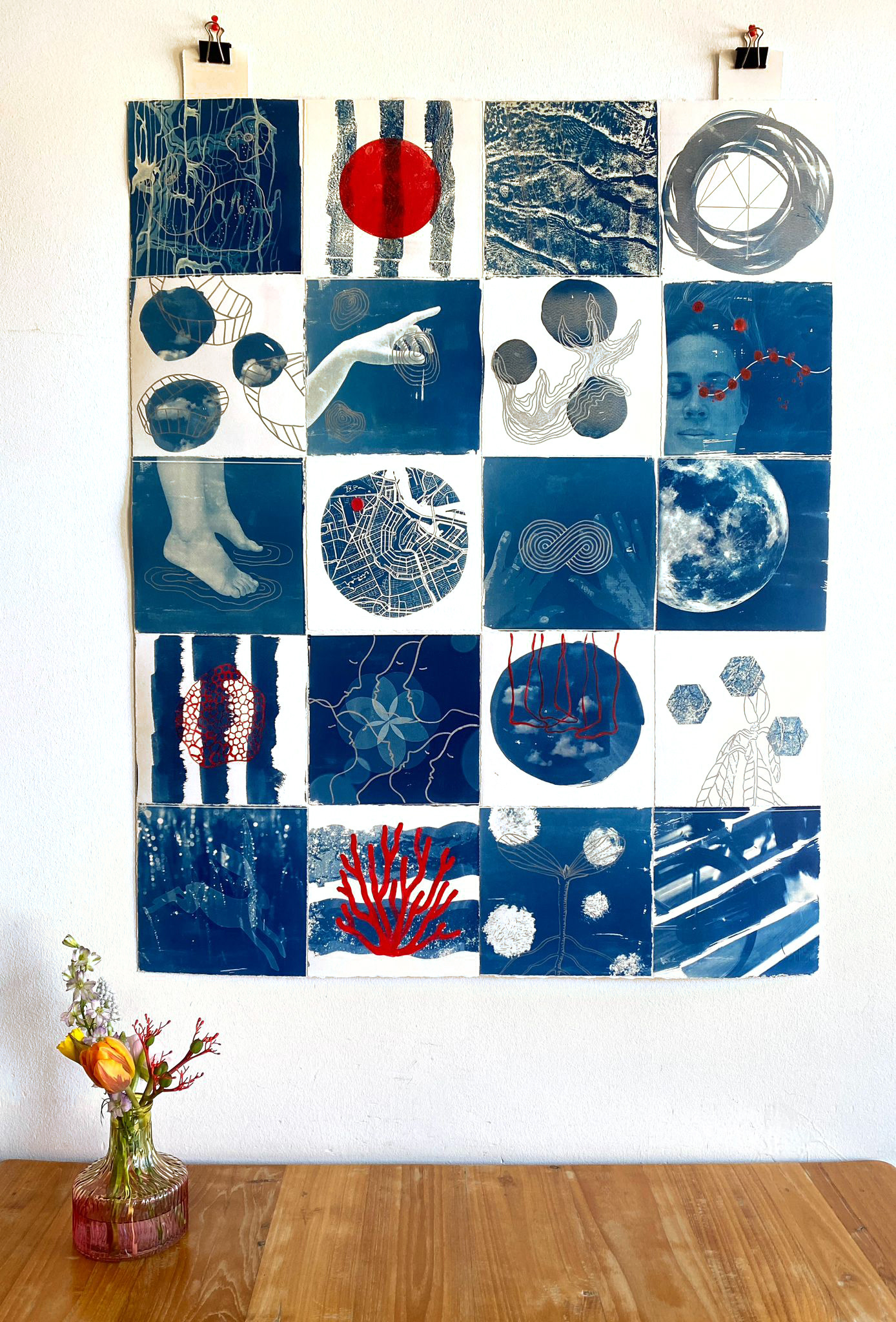 Werk in opdracht, cyanotype, inkt en zilverstift, Formaat 76 x 95 cm, 2023