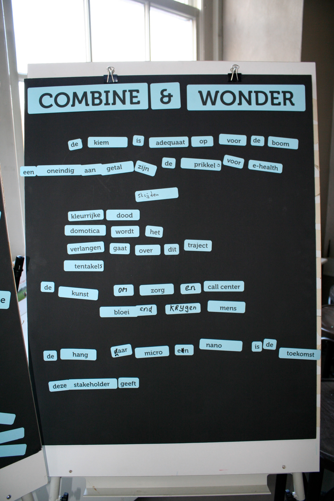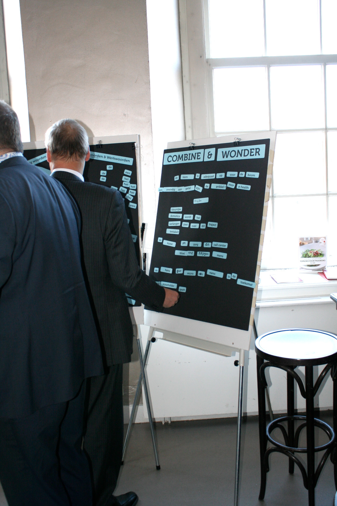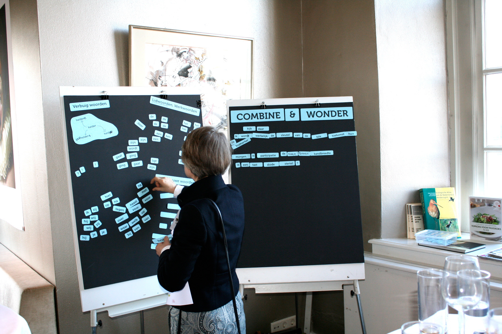Select, Combine & Wonder werd bij het netwerkdiner met het thema ‘Beschikbaarheid innovatieve technologie’ ingezet om de harde wereld van de techniek te verbinden met de zachtheid van poëzie. Door intuïtief gekozen woorden met elkaar te combineren ontstaan nieuwe gedachten, nieuwe onverwachte betekenissen.